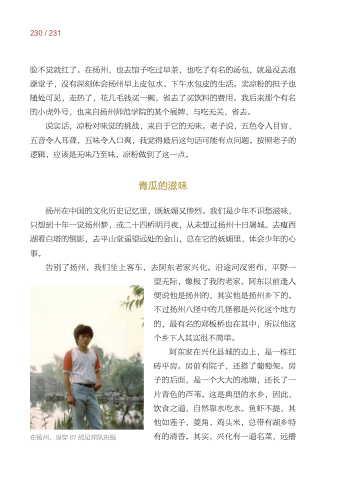 脸不觉就红了。在扬州 也去馆子吃过早茶 也吃了有名的汤包 就是没去泡 澡堂子 没有深刻体会扬州早上皮包水、下午水包皮的生活。卖凉粉的担子也 随处可见 走热了 花几毛钱买一碗 省去了买饮料的费用。我后来那个有名 的小虎外号 也来自扬州师范学院的某个展牌 与吃无关 省去。