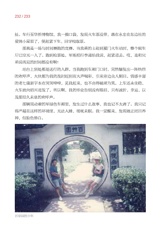 那真是一场与时间赛跑的竞赛。当我乘的士赶到厦门火车站时 整个候车 厅已空无一人了。跑到检票处 军练把行李递给我说 赶紧进去。哎 连和兄 弟说再见的时间都没有啊!