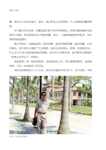 离开学校后 印象最深的一次吃田螺 是在桂林和阿赖一起吃田螺。1992 年夏天 我不知怎么搞到了几天假期 就决定去桂林玩。桂林一直是我们这一 代人对于山水之美的最原初的想象 因为在小学课本里 我们都学过那篇叫 “桂林山水甲天下”的课文。