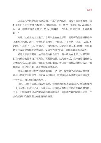 应该是几个同学在筼筜湖边找了一家不太大的店 也没有点太多的菜 我 们坐在户外的红色塑料板凳上 喝着啤酒 有一搭没一搭地闲聊。越喝越兴 起 桌上的菜有些不太够了 然后小镇喊道:“老板 给我们加一个清蒸海 蛏!”