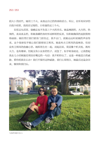 在现实生活里 强确实也不负其三个火的芳名。她是爽朗的 大方的 热 情的 直来直去的 和她袅娜的身材形成鲜明的反差 但和她微黑的皮肤倒相 得益彰。她经常打我们宿舍门前经过 我不出门 就能远远听到她的声音传 来。这个场景似乎能让我们联想到王熙凤 她是有点王熙凤的泼辣劲 但却 没有王熙凤的曲幽心思。她和男生在一起 说起话来 简直像个机关枪 既有 火力 也有雄辩。但她又有小女孩的性子 说急了 似乎转身就走 让我想起 我女儿小时候最经常挂在嘴边的一句话:我不和你玩了。这是一种最直白的威 胁 胁 看你把我怎么办?我们不惧怕这种威胁 我们心里明白 她最后还是会回 来 继续和我们玩。