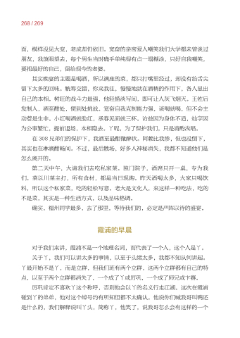 其实晚宴的主题是喝酒 所以满座的菜 都只打嘴里经过 却没有给舌尖 留下太多的回味。觥筹交错 你来我往 慢慢地就在酒精的作用下 各人显出 自己的本相。树旺的战斗力最强 他轻描淡写间 即可让人灰飞烟灭。王佐后 发制人 酒至酣处 便到处挑战。宽奋自我克制能力强 该喝就喝 但不会主 动惹是生非。小红喝酒就脸红 承春见面就三杯。访益因为身体不适 灿宇因 为公事繁忙 提前退场 本相隐去。丫呢 为了保护我们 只是清酌浅唱。