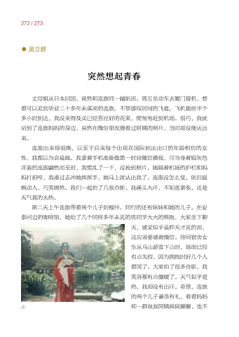 连旅出来得很晚 以至于后来每个出现在国际到达出口的年龄相仿的女 性 我都以为会是她。我拿着手机准备做第一时间微信播报 可当身着银灰色 洋装的连旅翩然而至时 我慌乱了一下 没抢到照片。她隔着机场的护栏和妈 妈打招呼 我凑过去冲她挥挥手 她马上就认出我了。连旅没怎么变 依旧温 婉动人 巧笑嫣然。我们一起拍了几张合影 我满头大汗 不知是紧张 还是 天气真的太热。