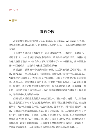 公园内的黄石湖是北美最大的高山湖之一 湖水宁静、清澈。火山岩堆成 的山丘是几百万年来 3 次火山爆发形成的。黄石河从山脉中横切而过 形成黄 石峡谷 与大峡谷连接在一起。峡谷中激流、瀑布不断 两岸的山石陡峭、凌 厉 石壁上的色彩随光线变幻不定。黄石公园占地广阔 从南到北要开车 2 个 多小时。园内主要有五个景区 虽然每个景区特点各不相同 但不管走到哪里 都能看到“有野兽出没”的警示牌。黄石公园是个自然保护区 园内生活着几 百种动物 再加上独特的地貌 公园管理人员既要保护自然生态 教育民众 又要保证游客安全。人类如何与自然和平共存?黄石公园在努力着