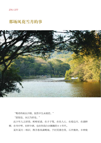 276 / 277 那场风花雪月的事 “唯将终夜长开眼 报答平生未展眉。” “匪报也 永以为好也。” 此少年人之深情 彬彬初盛 在才子笔 在佳人心 在海边月 在湖畔 柳 在书中琴 在杯中酒 也在你我白衣飘飘的80年代。 某年某月一相识 携手春风满鹭城。于时芙蓉含笑 石井腾欢。丰神俊