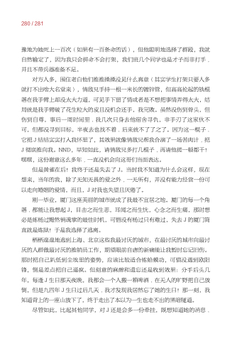 栖栖遑遑地逃到上海、北京这些我最讨厌的城市 在最讨厌的城市向最讨 厌的人群做最讨厌的推销员工作 期望眼前自虐的新痛能让我暂时忘记旧伤。 那时把自己趴低到尘埃里的姿势 应该比较适合练蛤蟆功 可惜没遇到欧阳 锋 倒是差点把自己逼疯。但刻意的麻醉和遗忘还是收到效果:分手后头几 年 每逢 J 生日那天夜晚 我都会一个人搬一箱啤酒 在无人的旷野把自己放 倒 但是九四年 J 生日过后几天 我才发现我居然忘了她的生日!那一刻 我 我 我 知道背上的一座山放下了 终于走出了本以为一生也走不出的黑暗隧道。