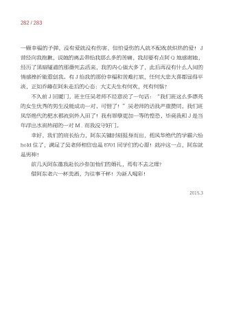 不久前 J 回厦门 班主任吴老师不经意说了一句话:“我们班这么多漂亮 的女生优秀的男生没能成功一对 可惜了!”吴老师的话我严重赞同 我们班 风华绝代的肥水都流到外人田了!我有罪孽更加一等的惶恐 毕竟我和 J 是当 年浮出水面热闹的一对 M 而我没守好门。