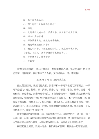 我:不是。 七:我是曾听过有一个 说是同学 但后来又有点犹豫。 我:哪个?为啥犹豫? 七:好像做生意的 她说的含含糊糊。 我:她同学还是我们同学? 七:她高中同学 不过跟我说好久了 现在哪个我不知。 (看来 七这儿一点有价值的信息都没有。) 我:打麻将去了。静待好音