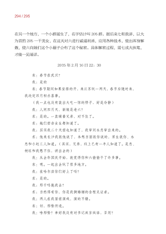 在另一个地方 一个小群诞生了 名字估计叫 205 群。据后来七和我讲 以大 为首的 205 一干美女 在这天对六进行威逼利诱 应用各种战术 使出浑身解 数 使六向她们这个小圈子公布了这个秘密。具体解密过程 需七或大执笔 才能一见端详。