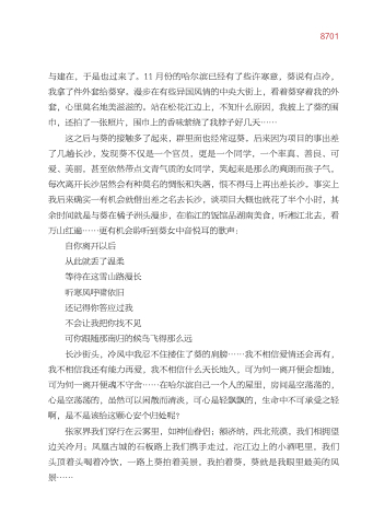 与建在 于是也过来了。11 月份的哈尔滨已经有了些许寒意 葵说有点冷 我拿了件外套给葵穿。漫步在有些异国风情的中央大街上 看着葵穿着我的外 套 心里莫名地美滋滋的。站在松花江边上 不知什么原因 我披上了葵的围 巾 巾 还拍了一张照片 围巾上的香味萦绕了我脖子好几天 这之后与葵的接触多了起来 群里面也经常逗葵。后来因为项目的事出差 了几趟长沙 发现葵不仅是一个官员 更是一个同学 一个率真、善良、可 爱、美丽 甚至依然带点文青气质的女同学 笑起来是那么的爽朗而孩子气 每次离开长沙居然会有种莫名的惆怅和失落 恨不得马上再出差长沙。事实上 我后来确实一有机会就借出差之名去长沙 谈项目大概也就花了半个小时 其 余时间就是与葵在橘子洲头漫步 在临江的饭馆品湖南美食 听湘江北去 看 万山红遍 更有机会聆听到葵女中音悦耳的歌声: