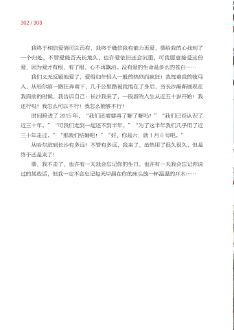 302 / 303 我终于相信爱情可以再有 我终于确信我有能力再爱 葵给我的心找到了 一个归处 不管爱能否天长地久 也许爱依旧还会沉重 可我愿意接受这份 爱 爱 爱 因为爱才有根 有了根 心不再飘泊。没有爱的生命是多么的苍白 我们义无反顾地爱了 爱得如年轻人一般的热烈而疯狂!我驾着我的牧马 人 从哈尔滨一路狂奔南下 几千公里路被我甩在了身后 当长沙渐渐展现在 我面前的时候 我告诉自己:长沙我来了 一段新的人生从近五十岁开始!我 还行吗?我怎么可以不行!我怎么能够不行!