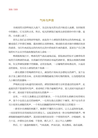 首先让我们必须得深呼吸的 就是各个小酒馆的菜肴传出的各种味道。田 螺或海瓜子伴着红辣椒、酱油调和出来鲜辣味 蛏或蛤在清水锅中沸腾时淡淡 的清香 当归牛肉汤发出的约有约无的中药味和牛肉的酱香 某家住户自己熬 制的叫不出名字的海鱼散发的诱人香味 啤酒瓶嘭地打开 啤酒花的气泡迅速地泛起 那股清凉的似乎又略带些苦 味的丹凤啤酒的味道、劣质廉价的四特酒在举起的酒杯里 散发出刺鼻的酒精 味 味 但又带着股猪腰子的腥臊 还有加饭酒 一点葡萄的香味都没有 只是涩 涩的甜味 充斥在小酒馆的某个角落 一群光着膀子的喝酒的年轻人 满身的汗臭味夹杂着喧天的酒气、某个女 孩子身上廉价的香水味、还有屋后稍微隐蔽地方呕吐物的腥臭 以及隐隐的某 人小解后的尿骚味 声响其实是与味道同时涌来的。酒馆里操持着方言和普通话的划拳声、此 起彼伏的干您佬的叫骂声、老虎鸡杠子筷子敲碗的声音、某人说到兴起拍桌子 的一砰、某间屋子里传来的张雨生的歌声 还有 一对恋人袅娜走过后爱的絮语、一个失恋的男生酒醉后哇的呕吐 声、某个少女扭头走后的抽噎声、一位男生抱头在路灯下痛哭、两个女生作弄 完小组男生清脆的笑声、一个男生拍胸脯的砰砰声和信誓旦旦的誓言 一群老乡在酒精的刺激下 操着听不懂的方言高叫 让人头皮阵阵发麻 一间房屋里母亲用闽南话训斥着女儿 远处某地传来一阵吉他弹唱的歌声 啤 酒瓶砸地破碎的清脆声 某间宿舍楼的房间里一个愤怒的男声 沙哑破碎 张 力十足 冲着东边社高喊:干您佬 都几点了 还让不让人睡啊!