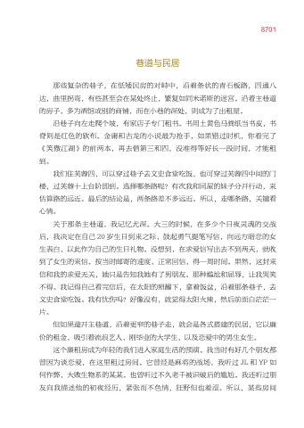 这个廉租房成为年轻的我们进入家庭生活的预演。我当时有好几个朋友都 曾因为谈恋爱 在这里租过房间。它曾经是麻将的战场 我听过 JL 和 YP 如 何作弊 大败生物系的某某。也曾听过不久老千被识破后的尴尬。我还听过朋 友向我描述他的初夜经历 紧张而不色情 狂野但也羞涩。所以 某些房间