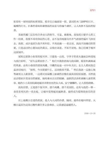 美丽的厦门实在有许多动人的细节 可是 渐渐地 我发现只要手头的工 作一结束 我便不再有停驻的心思 迫不及待地要向市井气浓郁的福州飞奔而 去。我想 或许是因为我不再年轻 不再浪漫 老实说 我找不到确切的答 案 只是返回的心愿如此的真实。实情应该是 不知不觉地 我已经属于福州 这座城市。