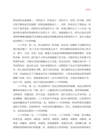 然如果你还爱着谁) 你的孩子 你的房子 你的车子 你的一官半职 你的 你的 你的 你的 你的 衣冠不整或者衣冠楚楚(如果还能楚楚动人)。当然 你肯定为了得到这一切 付出了很多很多 我和你付出的虽然不太一样 但我们都付出了三十年来一直 是同样长度的有黑夜和有白天的日子。所以 我要感恩日子 因为正是在这样 或哆哆嗦嗦或躲躲闪闪或窘迫或富足或艰难或困苦或喜悦的日子 我们才彼此 如此期待三十年的相聚。