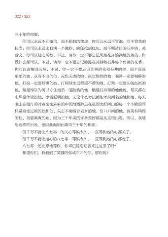 挂念 你可以永远比我快一个微秒 疯狂抢到红包 而不顾昔日的石井情、芙 蓉义。你可以随心所欲 不过 请你一定不要忘记凤凰花开始满地的落英 你 你 你 做什么都可以 不过 请你一定不要忘记弥漫在芙蓉和石井每个角落的花香 你可以清醒或沉醉 不过 你一定不要忘记芙蓉的我和石井的你 那个简简 单单的她、从容不迫的他、无忧无虑的她、淡定悠然的他 喝酒一定要喝醉的 他、打扮一定要烟熏的她 打网球永远都接不着的她 打架一定要头破血流的 他 他 他 他 他 踢足球以为可以守住最后一道防线的他 酷爱打排球的他他他 每天都在 电焊晶体管的他 冰雪聪明的她 无论什么考试都能考前两名的她和她 每天 晚上在熄灯后对着密密麻麻的中国地图游走在祖国大好河山的每一个小镇的同 样戴高度近视的他和他 矢志不渝暗恋老乡的他 信口开河的他 谈笑有鸿儒 的他 英姿飒爽的她 因为三十年来的许多美好都是从这里出发。所以 我感 恩这样的出发 也因此而如此期待三十年的相聚。