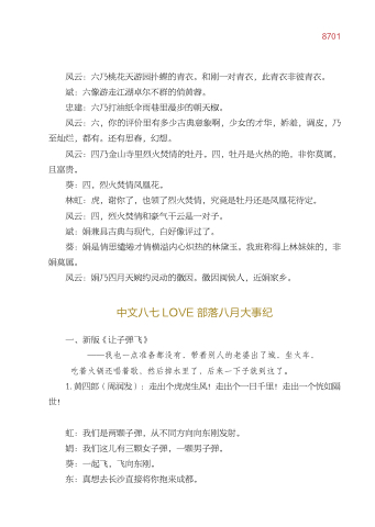 葵:四 烈火焚情凤凰花。 林虹:虎 谢你了 也领了烈火焚情 究竟是牡丹还是凤凰花待定。 风云:四 烈火焚情和豪气干云是一对子。 斌:娟兼具古典与现代 白好像评过了。 葵:娟是情思缱绻才情横溢内心炽热的林黛玉。我班称得上林妹妹的 非 娟莫属。