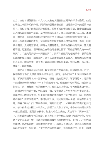 中文八七的专业学习时间 除了我所担任的课程外 我均未参与。不过 我却参加了他们大多数的政治思想学习。那时 学生们除了上不少的政治思 想、军事类课程外(如中国革命史、德育、政治经济学、军事理论) 还要有 一段时间的军训和每周一个下午的政治学习。他们在外地军训时 我仅前往 探看过一次 而每周一次的政治学习 我则基本上参加。学习是按班级小组 一起到男生宿舍进行的。所以每周一次 女生就从石井到芙蓉四男生宿舍来。 这样在学习的那天下午 男生就不能有如李白似的“天子呼来不上船 自称臣 是酒中仙”而恋床不起了。不过也有几次 我同早到的女生们一直站在宿舍门 外 外 等着“睡仙”们“草堂春睡足 窗外日迟迟” 才睡眼惺忪的慌忙打开门 来。每个宿舍就大概二十平方大 安置了五六张上下床 十个左右的男生窝在 一起生活起居 显得拥挤狭窄。加上六个女生光临 真也可称“济济一堂” 了。这种政治思想学习的制度 是上世纪五十年代以来我们大陆的特色 特别 是“文化大革命”中 可谓达到登峰造极史无前例的程度。上世纪八十年代初 中期时 在改革开放、实事求是的背景下 那种天天学毛选、时时斗私批修的 状况有所改变 但每周一个下午的政治思想学习 还是免不了的。以此 那时