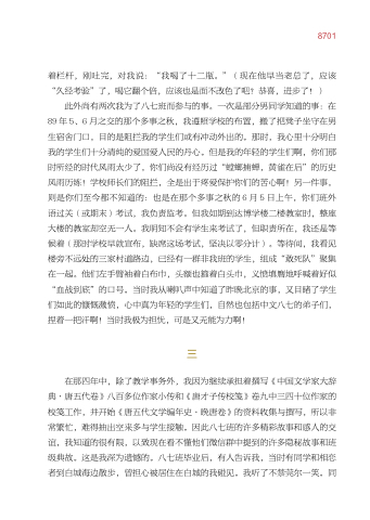 三 在那四年中 除了教学事务外 我因为继续承担着撰写《中国文学家大辞 典·唐五代卷》八百多位作家小传和《唐才子传校笺》卷九中三四十位作家的 校笺工作 并开始《唐五代文学编年史·晚唐卷》的资料收集与撰写 所以非 常繁忙 难得抽出空来多与学生接触。因此八七班的许多精彩故事和感人的交 谊 我知道的很有限 以致现在看不懂他们微信群中提到的许多隐秘故事和班 级典故。这是我深为遗憾的。八七班毕业后 有人告诉我 当时有同学和相恋 者到白城海边散步 曾担心被居住在白城的我碰见。我听了不禁莞尔一笑。同
