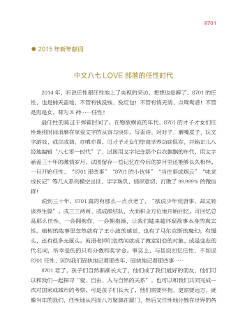 的才子才女们任 性地把时间消磨在享受文字的从容与快乐。写歪诗 对对子 磨嘴皮子 玩文 字游戏 或庄或谐 亦嗔亦喜。可才子才女们毕竟学养功底俱在 开始正儿八 经地编辑“八七零一时代”了 试图用文字纪念那个白衣飘飘的年代 用文字 用文字 涵盖三十年的激情岁月 试图留存一些记忆在今后的岁月里还能够长久相伴。 一旦开始任性 “8701 “8701 那些事”“8701 的小伙伴”“当往事成烟云”“味觉 成长记”等几大系列横空出世 字字珠玑 情深意切 打败了 99 99 999% 的微信 群!