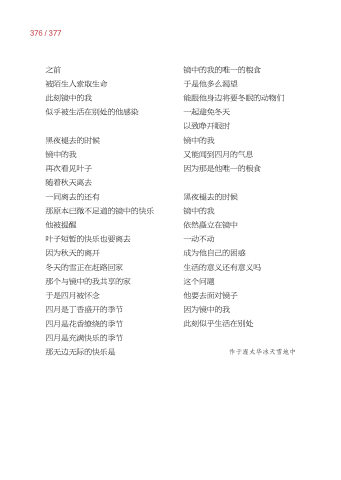 之前 镜中的我的唯一的粮食 被陌生人索取生命 于是他多么渴望 此刻镜中的我 能跟他身边将要冬眠的动物们 似乎被生活在别处的他感染 一起避免冬天