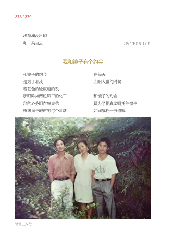 378 / 379 浅草淹没足印 和一朵白云 和镜子的约会 是为了看我 看苍色的脸羸瘦的发 那眼眸如两粒风干的化石 我的心分明在碎兄弟 粉末扬于城市的每个角落 1997 年 2 月 18 日 我和镜子有个约会 在每天 太阳入世的时候 和镜子的约会 是为了把真实嘱托给镜子 如同嘱托一份遗嘱 锵锵三人行