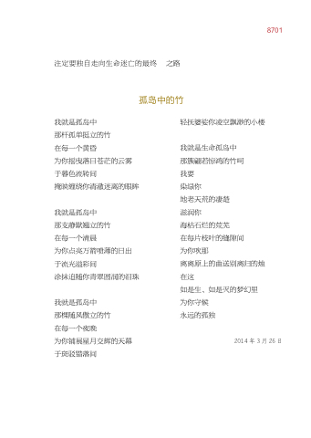 在每一个黄昏 我就是生命孤岛中 为你摇曳落日苍茫的云雾 那簇翩若惊鸿的竹呵 于暮色流转间 我要 掩映缠绕你清澈迷离的眼眸 染绿你