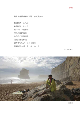 8701 随意地挥霍青春的狂野、寂寞和无奈 我们相约一九八七 我们相聚一九八七 也许我们不曾有意 但我们真的有缘 也许我们不曾相邀 但我们注定相遇 也许不曾相许一场风花雪月 却要相识走过一世一生一生一世 2016 年春天 思想者