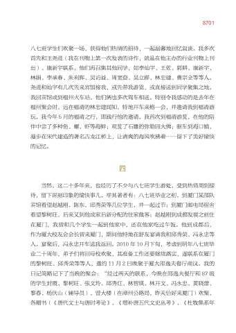 当然 这二十多年来 也经历了不少与八七班学生游处 受到热情周到接 待 留下深刻印象的愉快事儿。举其著者有:八七班毕业之初 到厦门某部队 宾馆看望赵越刚、陈东、邱秀荣等几位学生 并一起过节 到厦门邮电局宿舍 看望黎树旺 后来又到他成家后新分配的住家做客 赵越刚到成都发展之前住 在厦门 我曾和几个学生一起到他家中 还在他家吃过午饭。他到成都后 作为厦大校友会会长曾来厦门 期间他特地在舒友宴请我和邱秀荣、冯永忠等 人。宴聚后 冯永忠开车送我返回。2010 年 年 10 10 月下旬 考虑到明年八七班毕 业二十周年 弟子们将回母校欢聚 其准备工作还要继续落实 遂联系在厦门 的黎树旺、邱秀荣等等人 邀约 11 月 2 日晚聚于厦大邵逸夫餐厅商议。我的 日记简略记下了当晚的聚会:“经过两天的联系 今晚在邵逸夫餐厅和 87 级 的学生封霞、黎树旺、张文玲、邱秀红、林智瑛、林开文、冯永忠、黄晓蕾、 黎春、杨伏山(辅导员)、曾大楼(在漳州公路局 昨天恰好来厦门)欢聚 各赠书(《唐代文士与唐时考论》、《增补唐五代文史丛考》、《杜牧集系年
