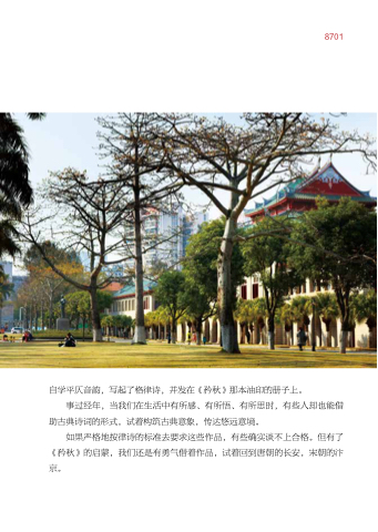 8701 自学平仄音韵 写起了格律诗 并发在《矜秋》那本油印的册子上。 事过经年 当我们在生活中有所感、有所悟、有所思时 有些人却也能借 助古典诗词的形式 试着构筑古典意象 传达悠远意境。 如果严格地按律诗的标准去要求这些作品 有些确实谈不上合格。但有了 《矜秋》的启蒙 我们还是有勇气借着作品 试着回到唐朝的长安 宋朝的汴 京。