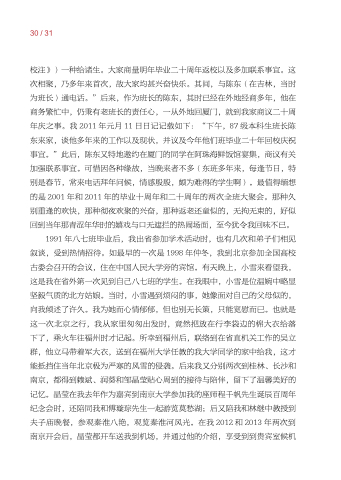 校注》)一种给诸生。大家商量明年毕业二十周年返校以及多加联系事宜。这 次相聚 乃多年来首次 故大家均甚兴奋快乐。其间 与陈东(在吉林 当时 为班长)通电话。”后来 作为班长的陈东 其时已经在外地经商多年 他在 商务繁忙中 仍秉有老班长的责任心 一从外地回厦门 就到我家商议二十周 年庆之事。我 2011 年元月 11 11 日日记记载如下:“下午 87 级本科生班长陈 东来家 谈他多年来的工作以及现状 并议及今年他们班毕业二十年回校庆祝 事宜。”此后 陈东又特地邀约在厦门的同学在阿珠海鲜饭馆宴集 商议有关 加强联系事宜。可惜因各种缘故 当晚来者不多(东班多年来 每逢节日 特 别是春节 常来电话拜年问候 情感殷殷 颇为难得的学生啊)。最值得缅想 的是 2001 年和 年和 2011 年的毕业十周年和二十周年的两次全班大聚会。那种久 别重逢的欢快 那种彻夜欢聚的兴奋 那种返老还童似的 无拘无束的 好似 回到当年那青涩年华时的嬉戏与口无遮拦的热闹场面 至今犹令我回味不已。