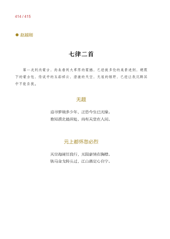 414 / 415 ● 赵越刚 七律二首 第一次到内蒙古 尚未看到大草原的震撼 已经被多伦的美景迷倒 朝霞 下的蒙古包 传说中的五彩祥云 澄澈的天空 无垠的绿野 已经让我沉醉其 中不能自拔。 无题 追寻梦境多少年 正恐今生已无缘。 谁知漠北最深处 尚有天堂在人间。 元上都怀忽必烈 天空海阔任我行 无限豪情在胸襟。 铁马金戈转头过 江山落定心自宁。