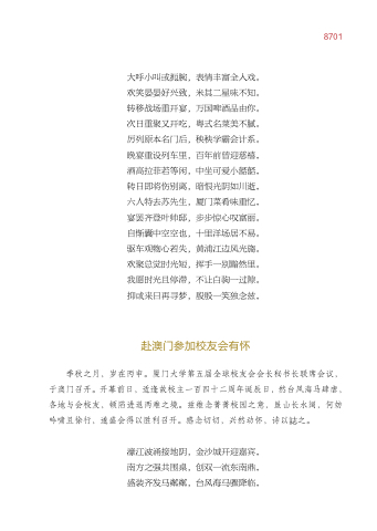 季秋之月 岁在丙申。厦门大学第五届全球校友会会长秘书长联席会议 于澳门召开。开幕前日 适逢故校主一百四十二周年诞辰日 然台风海马肆虐 各地与会校友 顿陷进退两难之境。兹维念菁菁校园之意 虽山长水阔 何妨 吟啸且徐行 遂盛会得以胜利召开。感念切切 兴然动怀 诗以誌之。