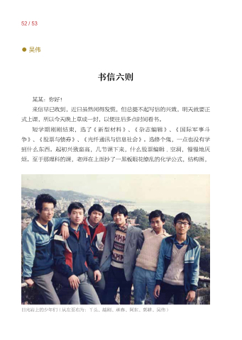 短学期刚刚结束 选了《新型材料》、《杂志编辑》、《国际军事斗 争》、《股票与债劵》、《光纤通讯与信息社会》。选修个鬼 一点也没有学 到什么东西。起初兴致蛮高 几节课下来 什么股票编辑 空洞 慢慢地厌 烦。至于那理科的课 老师在上面抄了一黑板眼花缭乱的化学公式 结构图 日光岩上的少年们(从左至右为:丫头、越刚、承春、阿东、郭耕、吴伟)