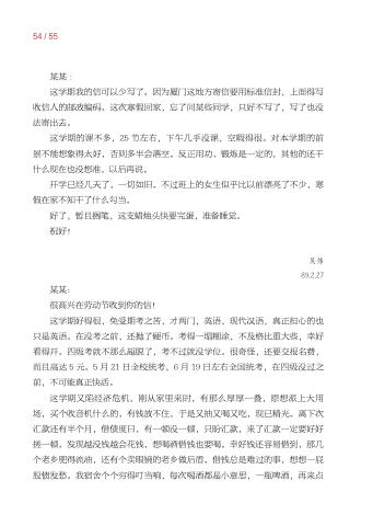 这学期我的信可以少写了。因为厦门这地方寄信要用标准信封 上面得写 收信人的邮政编码。这次寒假回家 忘了问某些同学 只好不写了 写了也没 法寄出去。