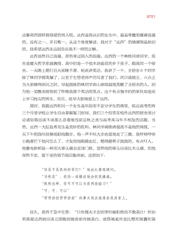 那时 我跟达西和另一个女生是年段里不安分学生的典型 临近高考的两 三个月里学校让学生自由掌握复习时间 我们三个经常在校外达西的宿舍里讨 论诸如鲁迅该不该那么恶毒地骂梁实秋之类与高考风马牛不相及的话题 当 然 达西一大缸盐煮花生是美妙的佐料。林同学调查清楚我不是他的情敌 一 一 天下午把我叫到操场陪他散步 他一声不吭大步流星地走了三圈 我呼哧呼哧 小跑着拦下他问怎么了 才发现他眼睛血红 憋得腮帮子鼓鼓的 有点吓人。 他像电影桥段一样用大拳头痛击足球门框 显然他的拳头应该比木头痛 但他 浑然不觉 接下来的情节我印象深刻 还原如下: