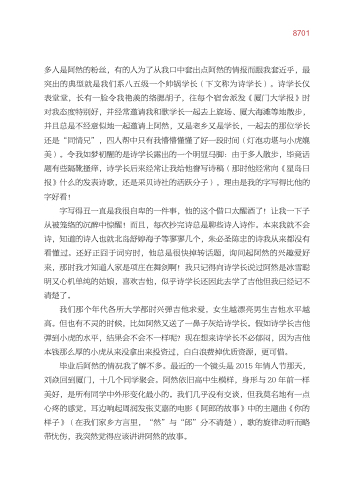 多人是阿然的粉丝 有的人为了从我口中套出点阿然的情报而跟我套近乎 最 突出的典型就是我们系八五级一个帅锅学长(下文称为诗学长)。诗学长仪 表堂堂 长有一脸令我艳羡的络腮胡子 往每个宿舍派发《厦门大学报》时 对我态度特别好 并经常邀请我和歌学长一起去上旋场、厦大海滩等地散步 并且总是不经意似地一起邀请上阿然 又是老乡又是学长 一起去的那位学长 还是“同情兄” 四人帮中只有我懵懵懂懂了好一段时间(灯泡功堪与小虎媲 美)。令我如梦初醒的是诗学长露出的一个明显马脚:由于多人散步 毕竟话 题有些隔靴搔痒 诗学长后来经常让我给他誊写诗稿(那时他经常向《星岛日 报》什么的发表诗歌 还是采贝诗社的活跃分子) 理由是我的字写得比他的 字好看!