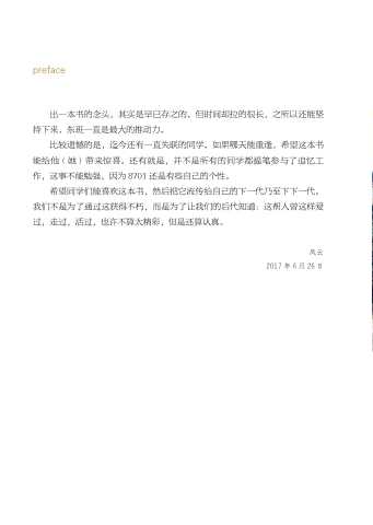比较遗憾的是 迄今还有一直失联的同学。如果哪天能重逢 希望这本书 能给他(她)带来惊喜。还有就是 并不是所有的同学都提笔参与了追忆工 作 这事不能勉强 因为 8701 还是有些自己的个性。