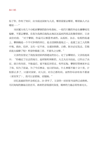 父亲的信坚定了我投身国家西部建设的信心。定了去攀钢后 父亲很是高 兴:“你确定了应去的地方 是明智和果断的 大丈夫应当如此 已作出了决 定 就只有向前 不能退后 更不能见异思迁 有所反悔。攀钢尽管离家乡远 了些 但为了前途 为了今后事业 也只好如此 什么事都不能十全十美 计 较那么多了 只要对国家、对人民、对自己都有利。虽然你母亲有些不愿意 (甚至哭了) 我可以安慰她 说服她。”