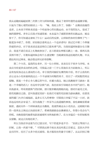 第二个火花 是我的女老乡 另一位小师妹。来来往往于家乡与学校 本 来应当有更多成功的机会吧 可惜是之前一门子心思放在北方姑娘身上 所以 没有发现身边这么漂亮的小花。幸亏我的同窗好友曹的转介绍 终于让我有机 会让这朵小花肯接纳我这么一个不谙情为何物的男子 经历了一次短暂的男女 接触。那是一个多么令人难忘的午后 在厦大海边 她让我教她学习游泳!真 是一个幸福的活儿!在没有学会换气前 我在前面引导她在水中闭气前行 她 她 向我游来 终有需要换气的时候 那只能仰赖我拥她而起。那闭月羞花之美 那花枝颤动之韵 直叫我感觉美好!给我们可爱的花姑娘当游泳教练 在那美 丽的厦门大学白城海滨 是多么可人的事情!可惜我只幸福了不足一小时 就 再也没有机会享受了。因为我做了一件至今让我遗憾的事情 我吃着碗里看着 锅里 遇到另外一个师妹请我去当教练 我竟然离这朵小花而去。这刚刚开始 的一段男女之情这么快就结束了。看着我兢兢业业教着别人 你想小花会生气 的吧。当晚我想约她看电影就被理所当然地拒绝了。在大学最后一年的短暂男 女接触 就这么快地结束了。