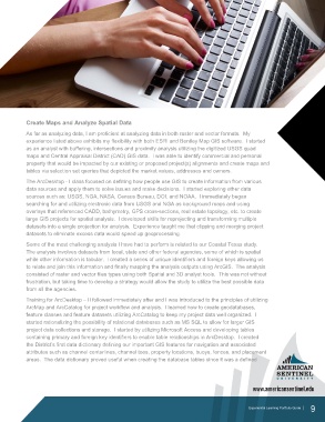 ArcMap and ArcCatalog for project workflow and analysis. I learned how to create geodatabases,