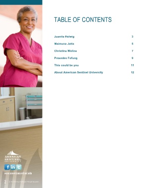 TABLE OF CONTENTS Juanita Helwig 3 Maimuna Jatta 5 Christina Woline 7 Praxedes Fofung 9 This could be you 11 About American Sentinel University 12 www.americansentinel.edu 2 | Transforming Healthcare Through Education