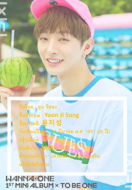 ชื่อไทย : ยุน จีซอง ชื่ออังกฤษ : Yoon Ji Sung ชื่อเกาหลี: 윤지성 วันเดือนปีเกิด : 08 มีนาคม ค.ศ. 1991 (26 ป ี) กรุ๊ปเลือด : B ต้นสังกัด : MMO Ent. ต าแหน่งในวง : (หัวหน้าวง) นักร้องเสริม แร็ปเปอร์เสริม