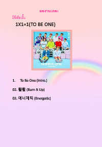 ผลงานเพลง มินิอัลบั้ม 1X1=1(TO BE ONE) 1. To Be One (Intro.) 02. 활활 (Burn It Up) 03. 에너제틱 (Energetic)