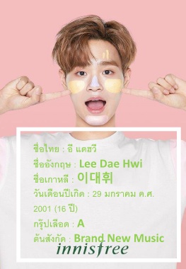 ชื่อไทย : อี แดฮวี ชื่ออังกฤษ : Lee Dae Hwi ชื่อเกาหลี : 이대휘 วันเดือนปีเกิด : 29 มกราคม ค.ศ. 2001 (16 ป ี) กรุ๊ปเลือด : A ต้นสังกัด : Brand New Music