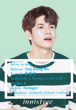 ชื่อไทย :อง ซองอู ชื่ออังกฤษ : Ong Seong Wu ชื่อเกาหลี : 옹성우 วันเดือนปีเกิด: 25 สิงหาคม ค.ศ.1995 (22 ป ี) กรุ๊ปเลือด: A ต้นสังกัด : Fantagio ต าแหน่งในวง : นักเต้นหลัก นักร้องน า ภาพลักษณ ์