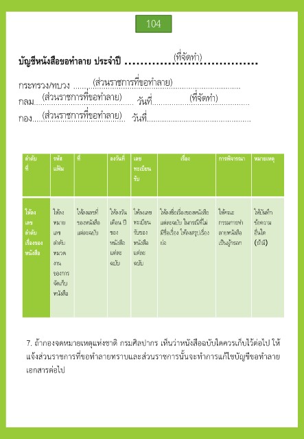 7. ถ้ากองจดหมายเหตุแห่งชาติ กรมศิลปากร เห็นว่าหนังสือฉบับใดควรเก็บไว้ต่อไป ให้