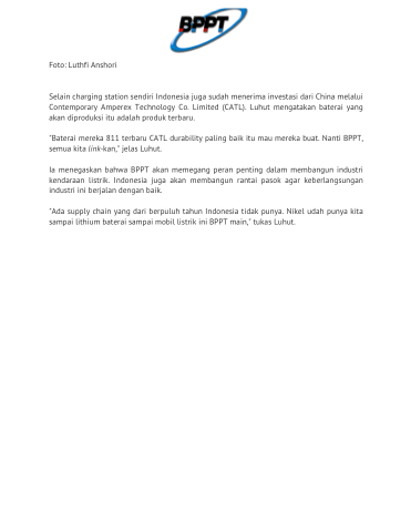 Selain charging station sendiri Indonesia juga sudah menerima investasi dari China melalui Contemporary Amperex Technology Co. Limited (CATL). Luhut mengatakan baterai yang akan diproduksi itu adalah produk terbaru.