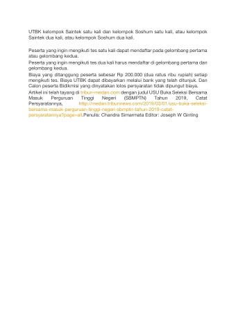 Artikel ini telah tayang di tribun-medan.com dengan judul USU Buka Seleksi Bersama Masuk Perguruan Tinggi Negeri (SBMPTN) Tahun 2019, Catat Persyaratannya, http://medan.tribunnews.com/2019/03/01/usu-buka-seleksi- bersama-masuk-perguruan-tinggi-negeri-sbmptn-tahun-2019-catat- persyaratannya?page=all. Penulis: Chandra Simarmata Editor: Joseph W Ginting
