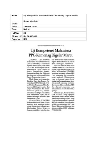 Judul Uji Kompetensi Mahasiswa PPG Kemenag Digelar Maret Media Suara Merdeka Terbit 1 Maret 2019 Tone Netral Hal/link 24 PR VALUE Rp.54 000,000 Reporter D10